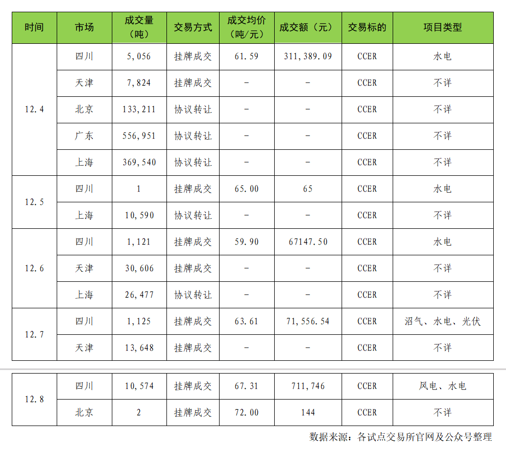 本周(12月4日至12月8日)各試點(diǎn)交易市場(chǎng)中,國家核證自愿減排量(CCER)總成交量為116.67萬(wàn)噸,較上周下降69.04%,其中最高成交均價(jià)為北京綠色交易所72.00元/噸,具體交易情況如下: