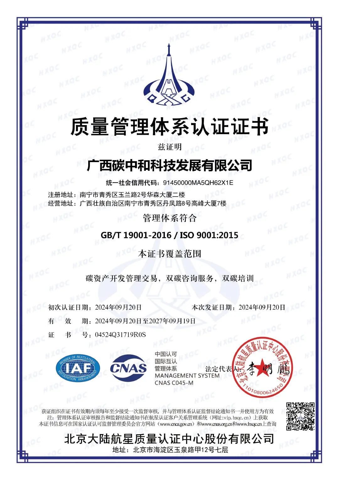 9月20日,廣西碳中和科技發(fā)展有限公司順利通過(guò)ISO9001質(zhì)量管理體系、ISO14001環(huán)境管理體系、ISO45001職業(yè)健康安全管理體系等三項國際標準體系認證。 通過(guò)三項體系認證,表明廣西碳中和公司的“雙碳”產(chǎn)品和服務(wù)在質(zhì)量、環(huán)境、職業(yè)健康安全管理方面達到了國際標準化水平,標志著(zhù)公司發(fā)展戰略和內部管理邁上了新臺階,為公司可持續發(fā)展奠定了良好的基礎。 廣西碳中和公司是一家在國家“雙碳”目標政策背景下成立的國有企業(yè),主營(yíng)業(yè)務(wù)為“雙碳”咨詢(xún)(碳達峰碳中和咨詢(xún)、碳排放統計核算與綠色低碳解決方案、碳管理數字化解決方案等)、林業(yè)碳匯等溫室氣體自愿減排項目開(kāi)發(fā)、碳資產(chǎn)管理和交易、“雙碳...